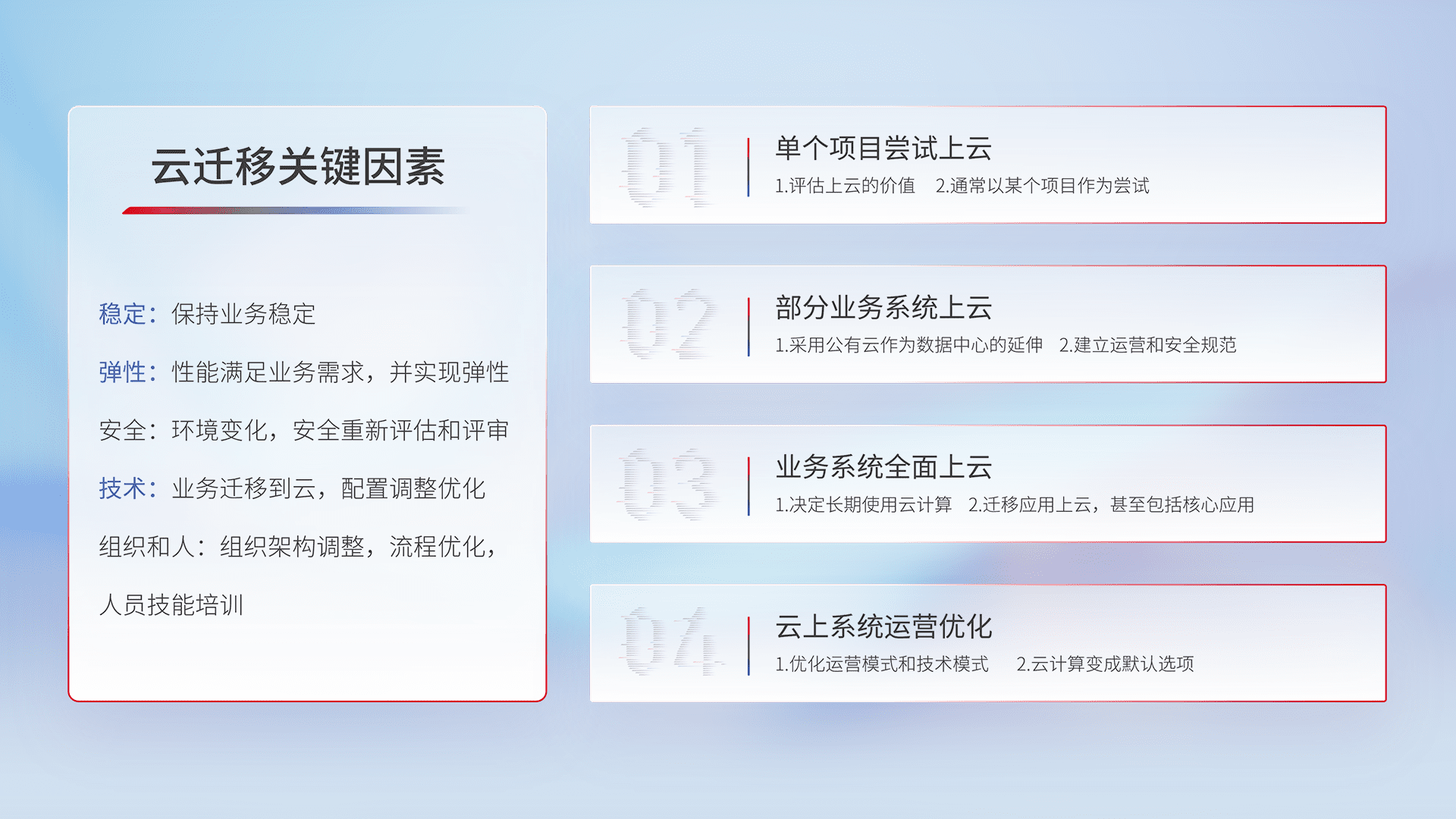 结合实际业务,,,从规划设计、、、、云平台选型、、、、云原生改造、、、、数据迁移、、、集成交付,,,,迁移全过程为客户识别最佳上云路径,,做好风险识别管理,,,,设计网络架构、、、身份权限、、、、安全审计合规、、、操作审计、、、日志审计、、、监控告警策略、、多站点容灾设计等,,,,对云上基础设施进行整体规划,,提升IT治理水平,,,以满足弹性、、、高可用、、高性能的需求。。